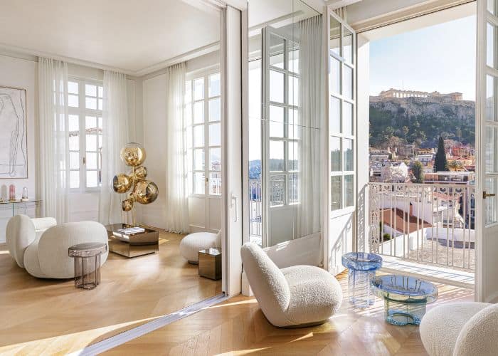In the heart of Athens’ historical centre, The Dolli stands as a neoclassical masterpiece — a century-old mansion transformed into one of Europe’s most celebrated boutique hotels. Overlooking the Acropolis, the property’s sun-drenched rooms and suites are dressed in marble, art, and quiet elegance, with interiors that feel more like a private residence than a hotel.